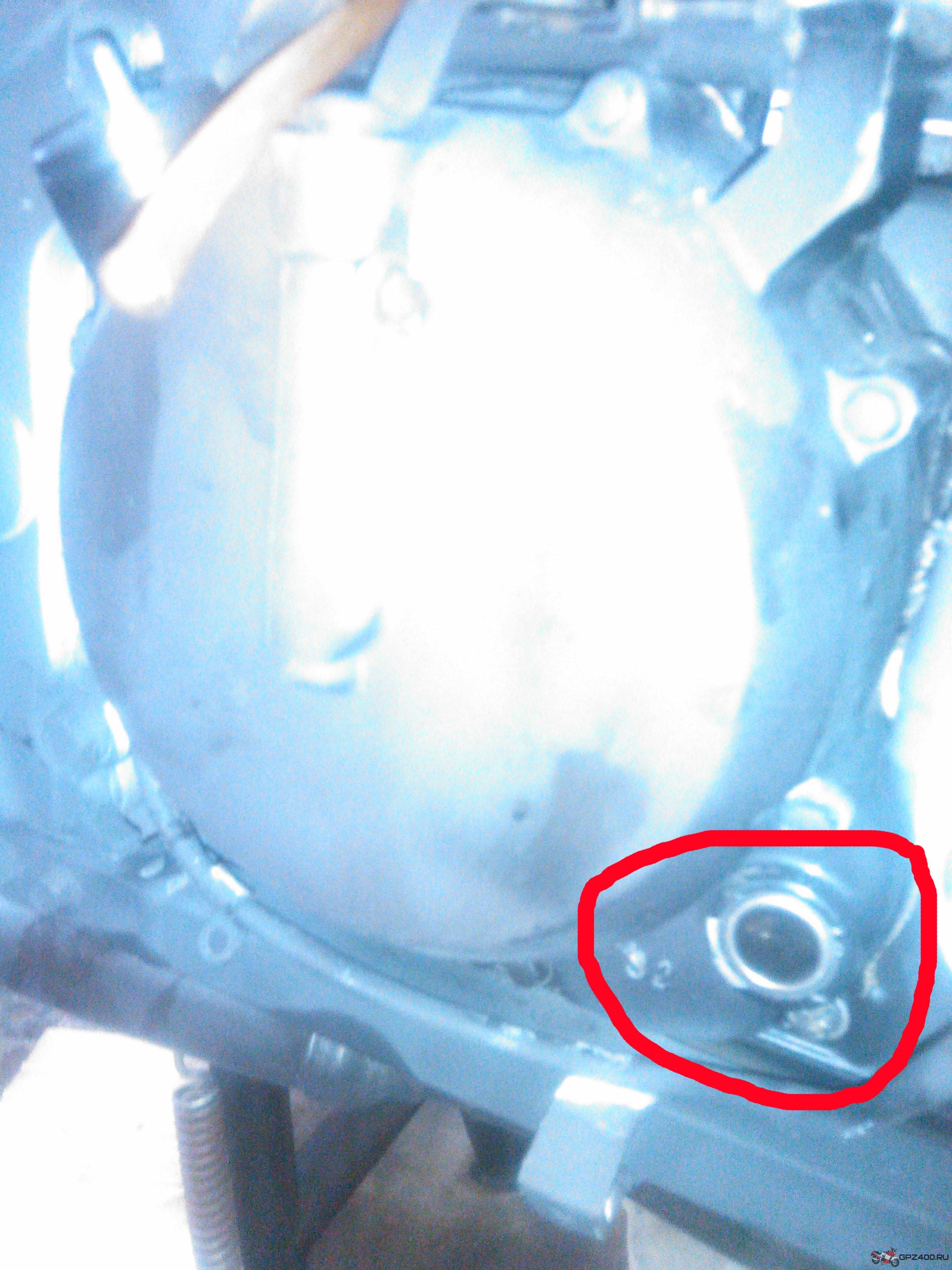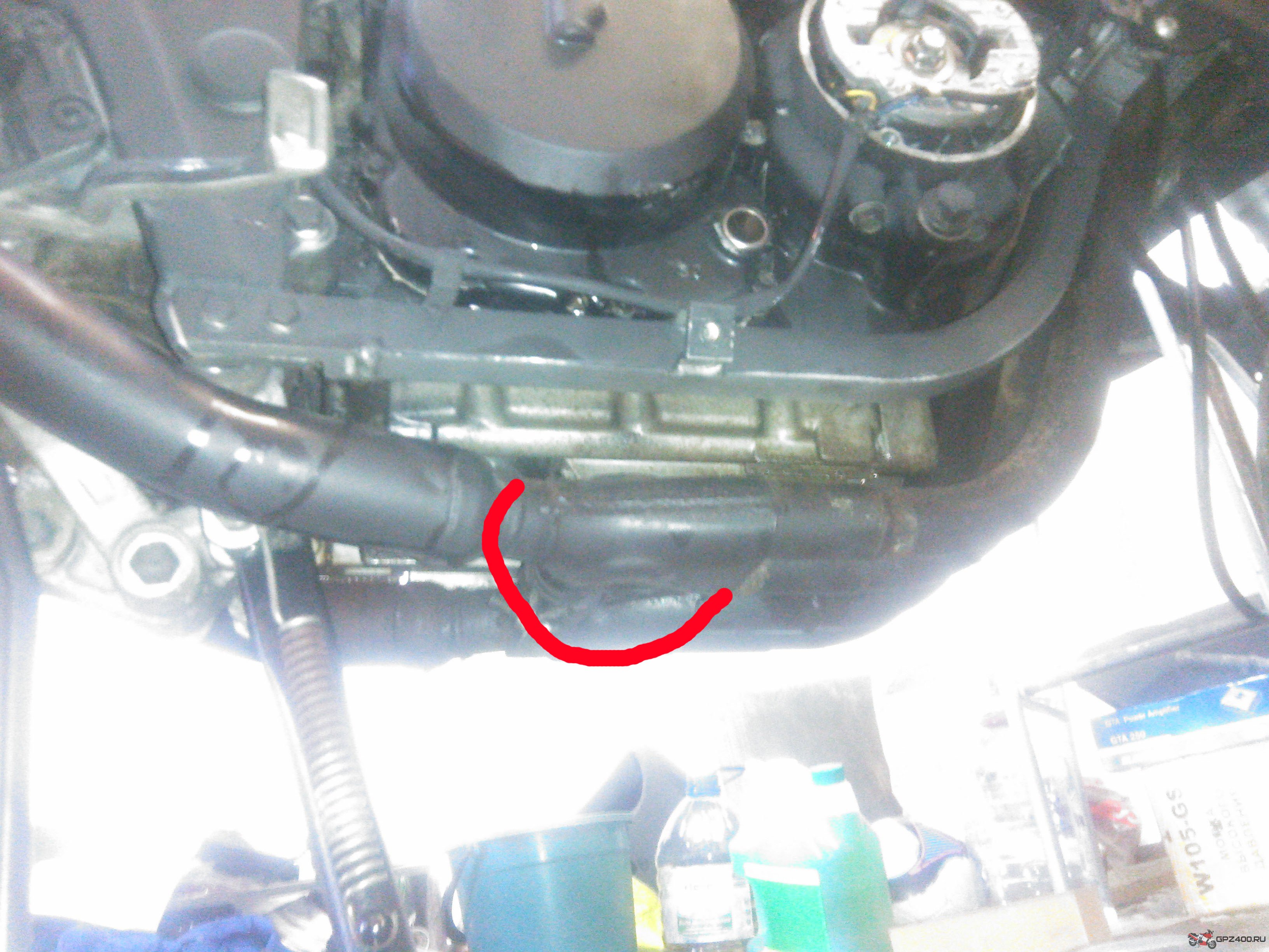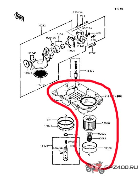 Масленый фильтр на GPZ400 находится под днищем. Закручивается в металлический стакан - на схеме номер 13169. Откручивается он ключом на 17. Сделать четкое фото проблемно, но его легко заметить самому.